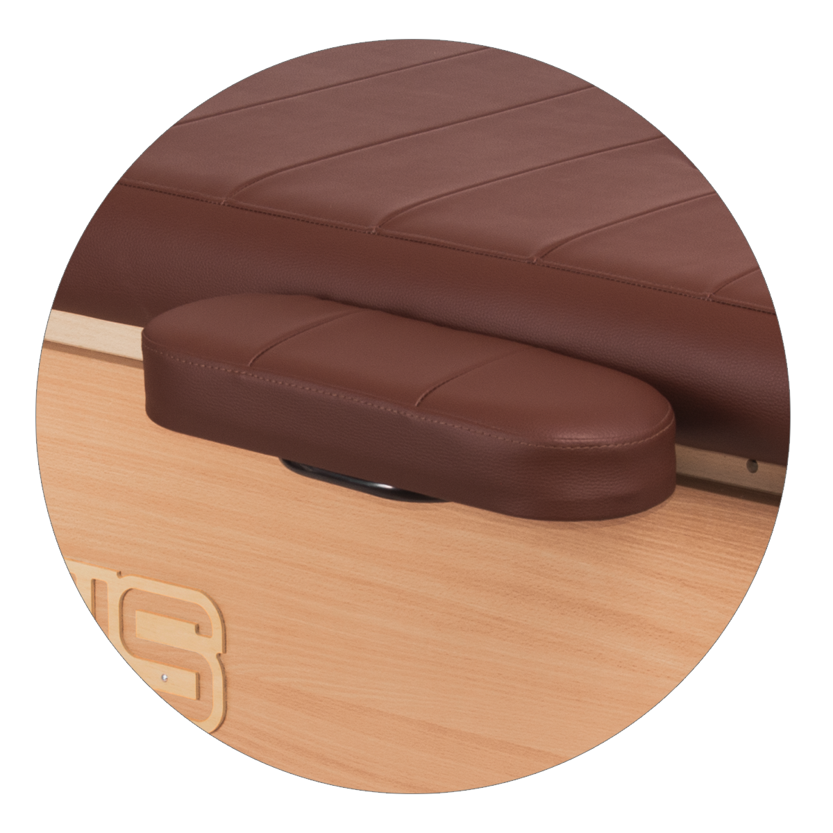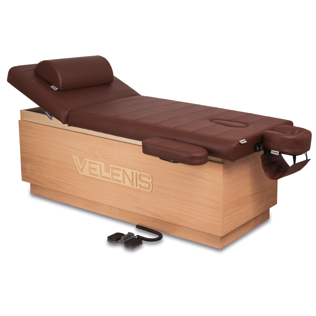 Leżanka Velenis P wyróżnia się nie tylko stylowym designem z drewna o eleganckim wykończeniu i wyraźnym logo Velenis, ale także niezrównaną funkcjonalnością. Dzięki elektrycznej regulacji wysokości sterowanej za pomocą pilota nożnego, terapeuci mogą płynnie i wygodnie dostosować pozycję leżanki do potrzeb klienta. Regulowane oparcie i segmenty na ramiona pozwalają na pełne dopasowanie, co zwiększa komfort i wsparcie podczas każdego zabiegu. Ta leżanka jest idealna zarówno do masażu klasycznego, jak i specjalistycznych terapii, nadając gabinetowi prestiżowy charakter.