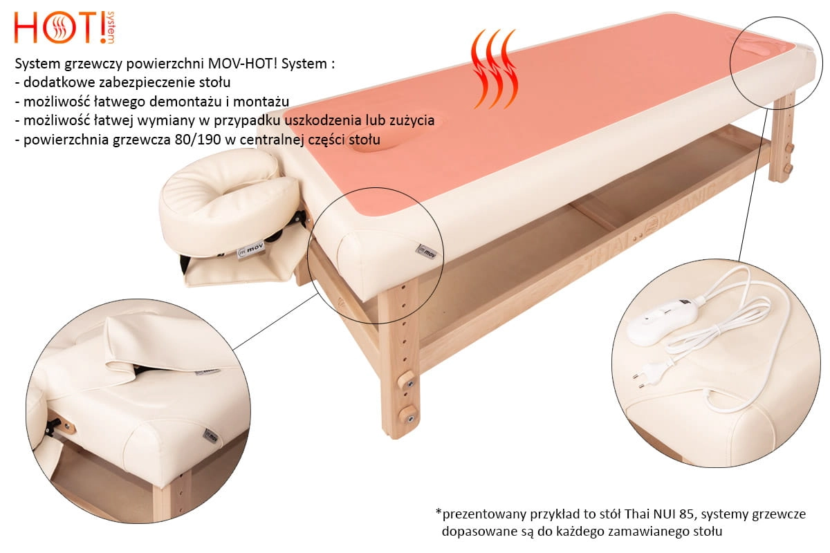 Velenis P HOT! – podgrzewana profesjonalna leżanka do masażu o szerokości 76 cm i długości 200 cm. Wyposażona w regulowane oparcie, segmenty na ramiona, otwór na twarz z zaślepką oraz elegancką drewnianą konstrukcję z logo Velenis. Idealna do gabinetów SPA i masażu, oferuje komfort i funkcjonalność dzięki elektrycznej regulacji wysokości.